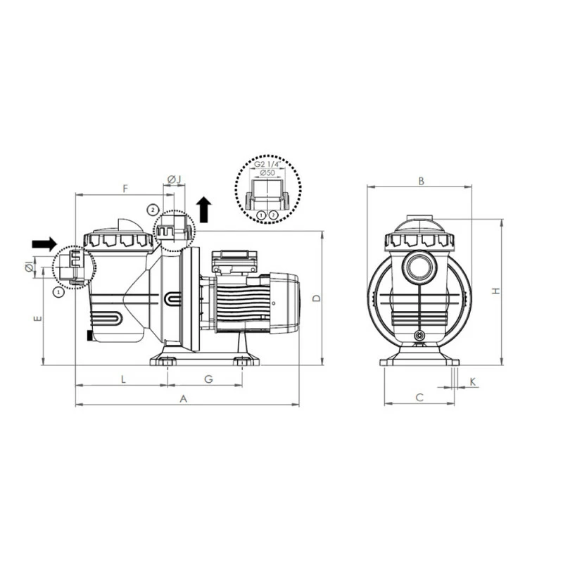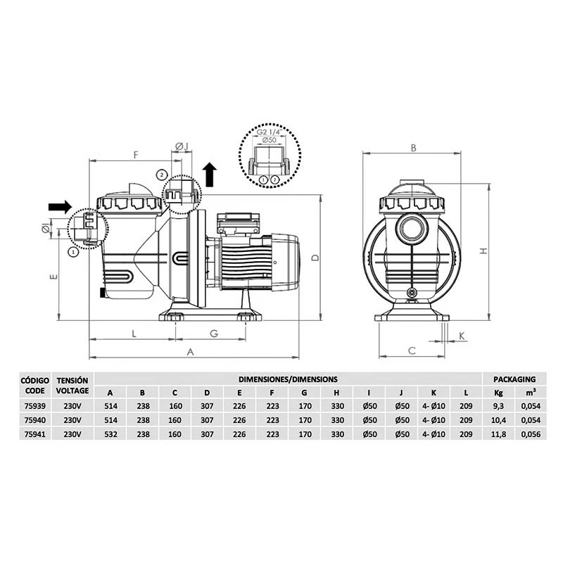 En el dibujo a continuación, podremos ver todas las medidas de la bomba de filtración. Las medidas están indicadas en milímetros mm.