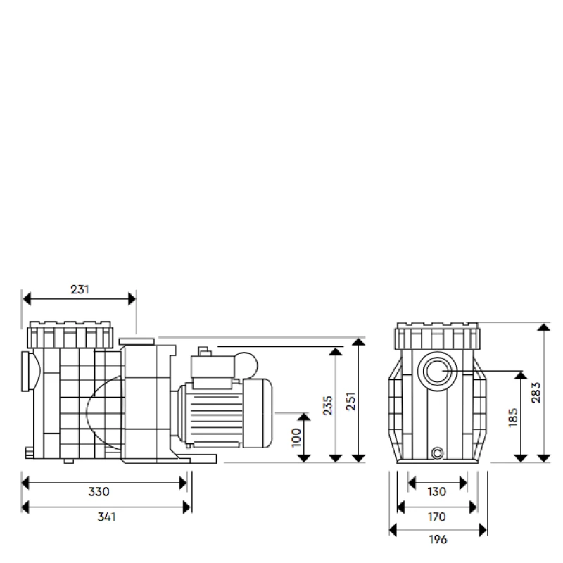 En el dibujo a continuación, podremos ver todas las medidas de la bomba de filtración. Las medidas están indicadas en milímetros mm.
