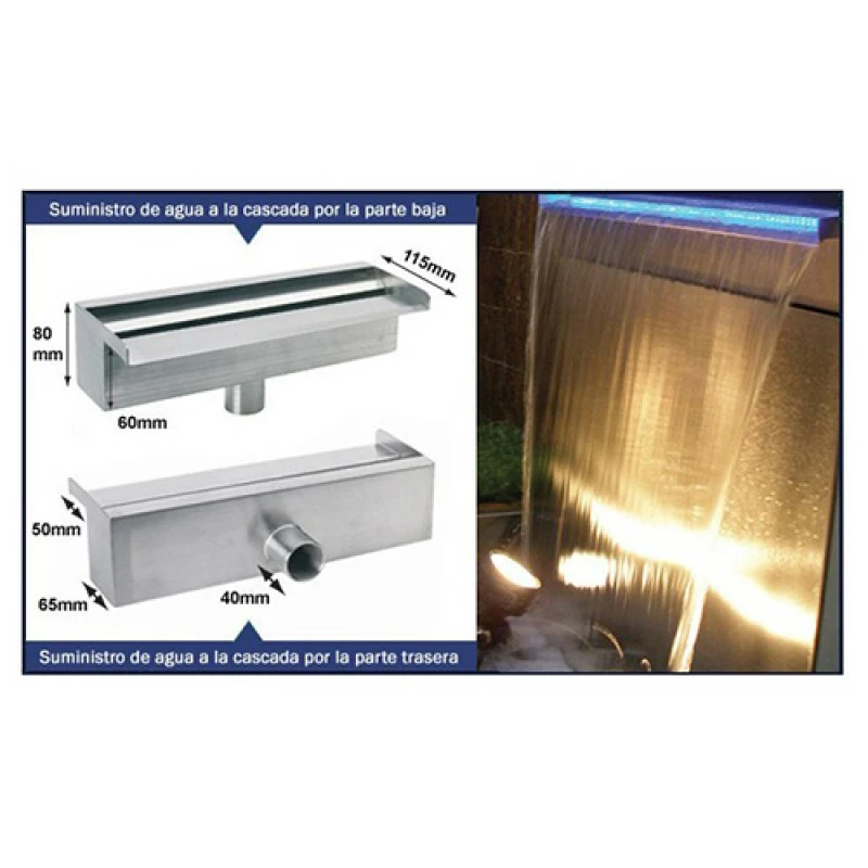 La cascada SilkFlow es una cascada de agua empotrada en la pared diseñada para crear una cortina de agua con gran caudal para generar sensación de relajación en la piscina. Su instalación queda completamente escondida en la pared, quedando así integrada completamente en el entorno y dando un efecto altamente decorativo. Su alimentación se puede llevar a cabo con un circuito de retorno de filtración o con una bomba de específica. Se ha fabricado con un material de alta gama como es el ABS, el cual es un producto muy resistente a la corrosión del material. Se encuentra disponible en 4 medidas: 300, 600, 900, 1200 mm.
