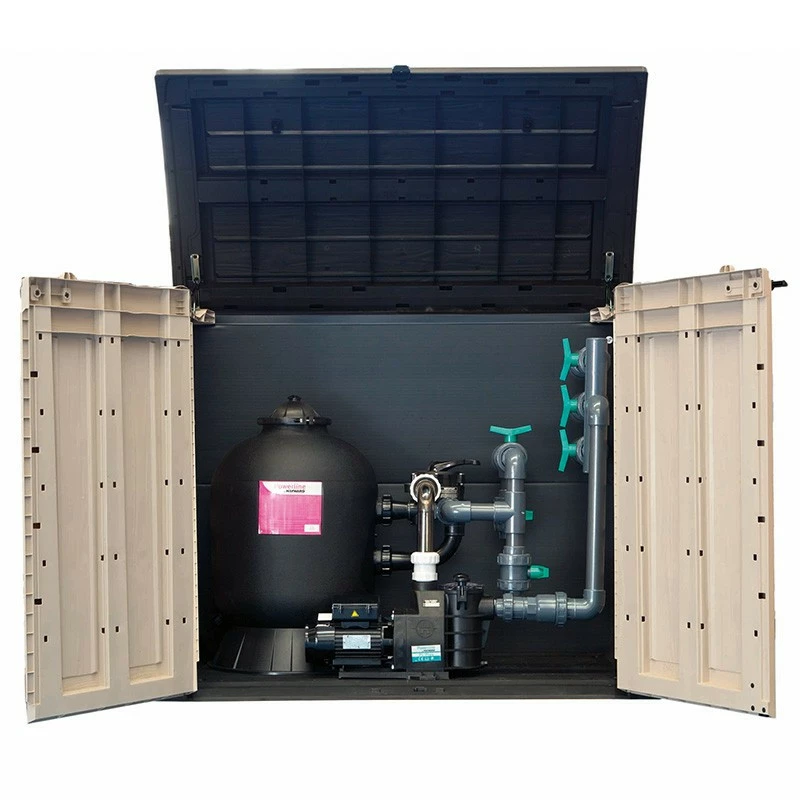 Contenedor o caseta para la instalación de sistema de filtración en piscina. Se trata de un producto con material Hayward, compuesto por filtro y bomba Hayward Powerline.
