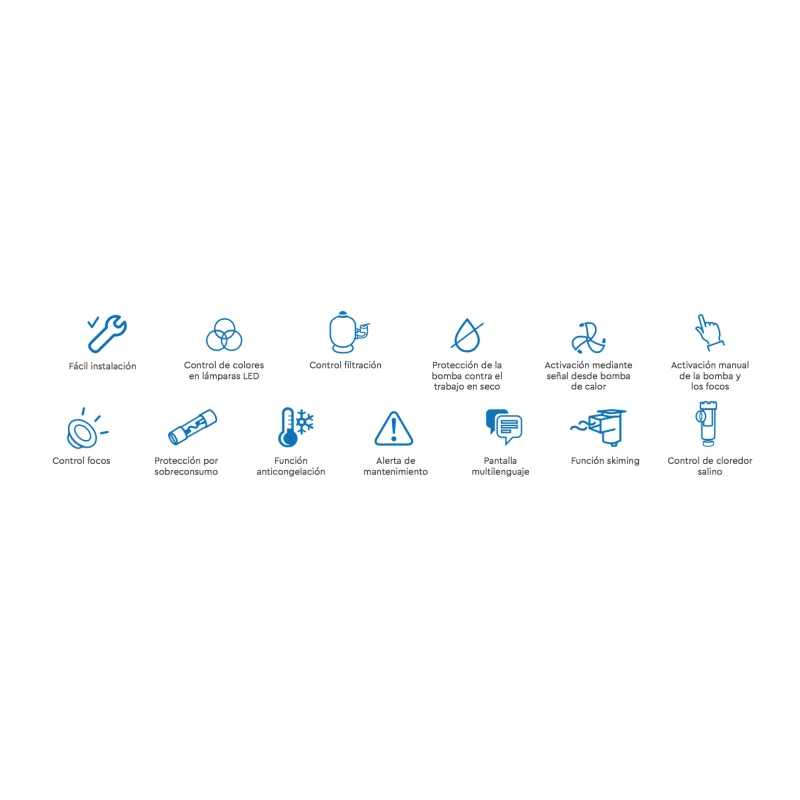 Incorpora de serie las máximas protecciones para la bomba, incluye relojes programadores de filtración, entradas y salidas para el sistema de luces, sonda de temperatura PT100. Los controladores para las piscinas, nos ayudan a tener perfectamente en línea, controlado y organizado para que así podamos disfrutar más de la piscina sin tener que pensar en casi nada.