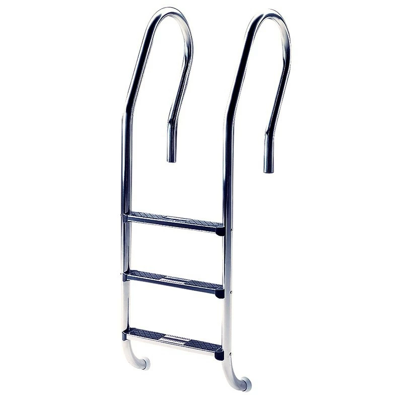 Escalera de estructura tubular de acero inoxidable (Ø 43 mm) para piscinas enterradas disponible en modelos de 2, 3, 4 y 5 peldaños. Posibilidad de peldaños antideslizantes en el modelo LUXE.