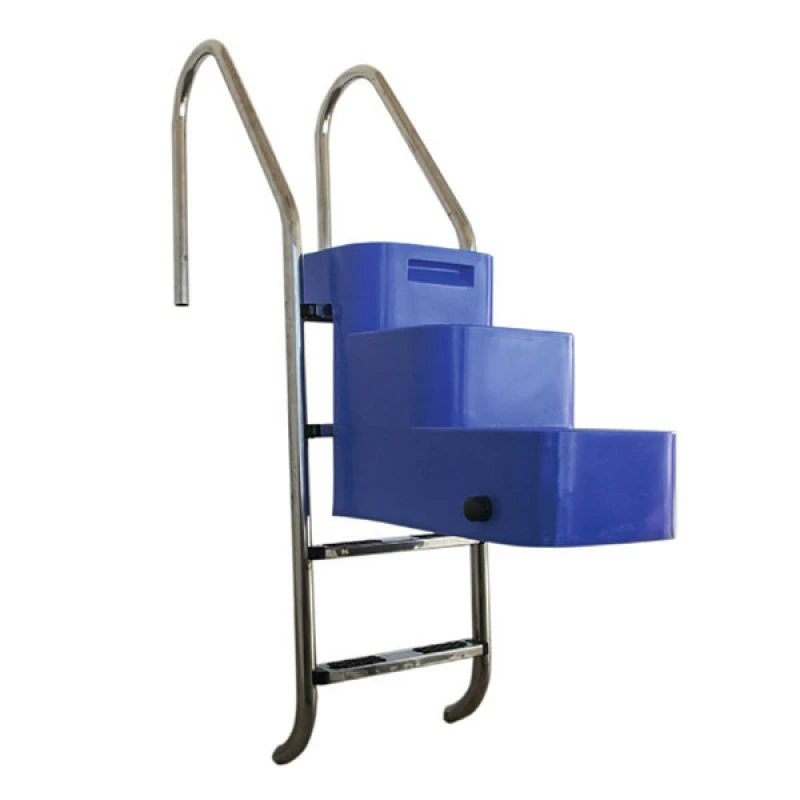La escalera de color azul está fabricada en plástico. Es de sencilla colocación, e incluye un asa ergonómica en el peldaño superior para facilitar su integración con la escalera de acero.