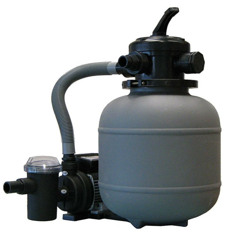 Filtración de arena (20kg) de 4m3/h, con válvula D-4 selectora de 4 vías. Bomba de 0,33 CV con prefiltro.