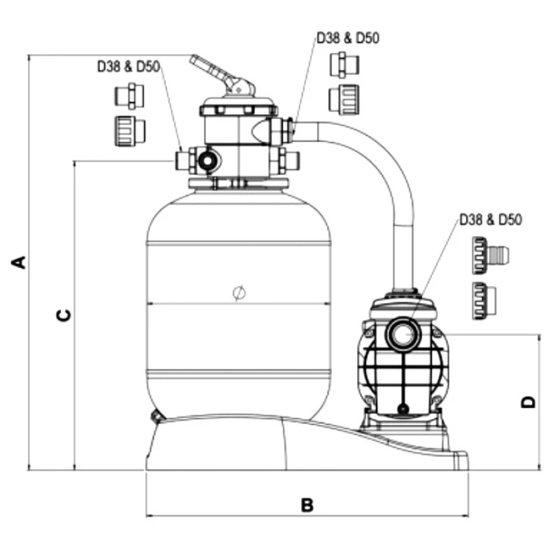 Incluyen racores de 38mm y 50mm para fácil instalación.