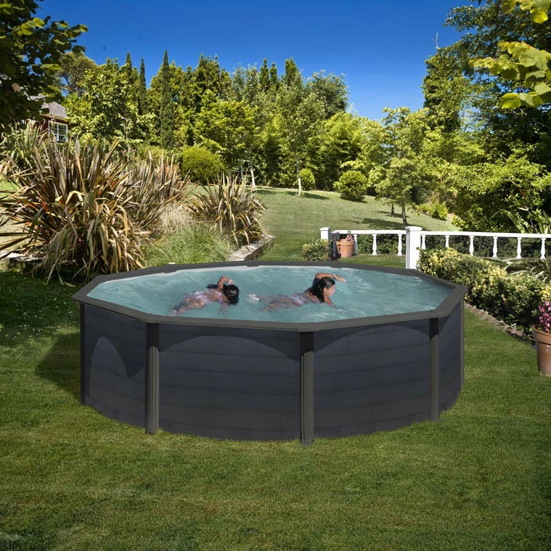 La piscina redonda de aspecto grafito y con altura estándar de 120 cm pertenece a la gama Starpool de Gre. Una serie de piscinas desmontables que se comercializan sin accesorios extra como escaleras o equipos de filtración. Una ventaja para el usuario exigente que desea equipar su piscina con los complementos que él considere adecuados; le permite elegir entre un amplio catálogo de accesorios de múltiples fabricantes y de diversas características. Una solución idónea, también, para las personas que desean sustituir sus piscinas, pero mantener y aprovechar el equipamiento.
