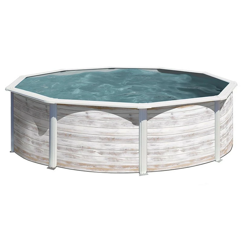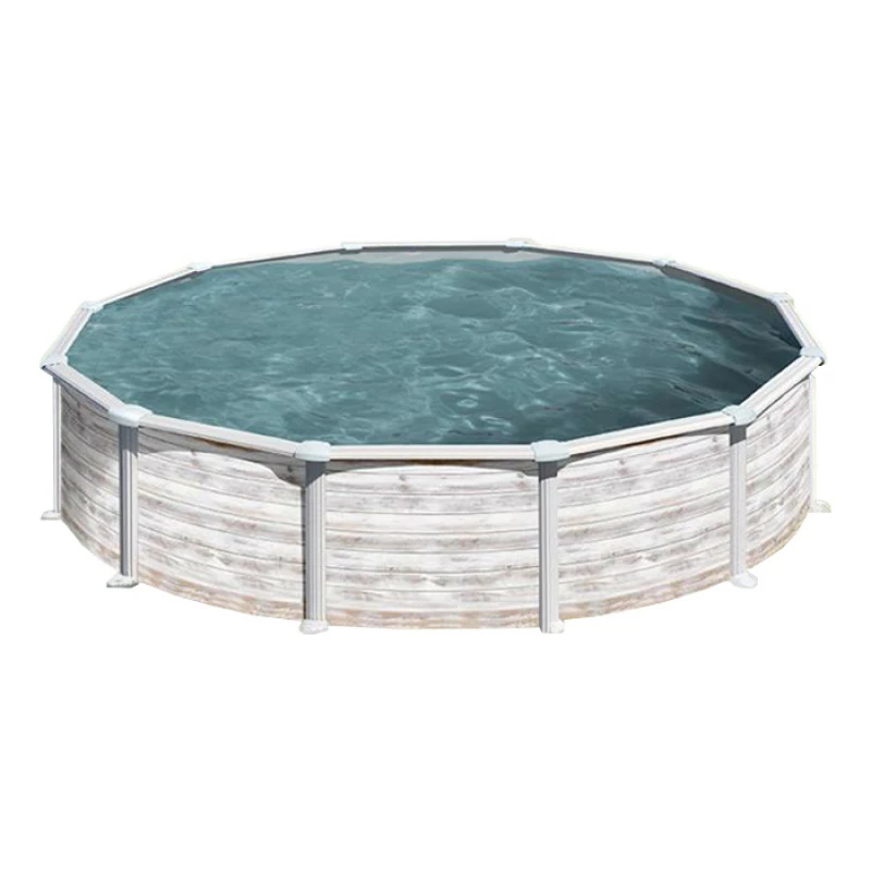 Atractiva y llamativa, así se describe la piscina circular con diseño nórdico de la gama Starpool de Gre. Pocas veces habrá tenido el placer de contemplar una piscina con una estética tan original como la madera serigrafiada en color blanco sobre la estructura de una piscina desmontable. Usualmente, acostumbramos a ver piscinas tubulares de PVC en el tradicional color azul turquesa, y, en casos en los que los propietarios buscan un producto más robusto y de mayor calidad, nos encontramos con piscinas de madera. El modelo nórdico de Gre constituye toda una innovación en diseño de piscina desmontable elevada.