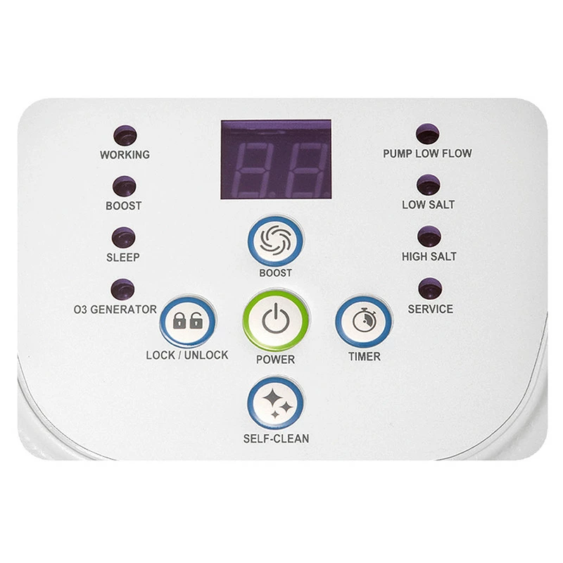 Este desinfectante de agua para piscinas incorpora tres modos de autolimpieza: ciclos de 6 horas, 10 horas y 14 horas. Incluye: placas de titanio, botón de encendido adicional y reloj automático 24 horas/ciclo. El voltaje del aparato es de 220-240V con GFCI (interruptor de circuito con toma de tierra).