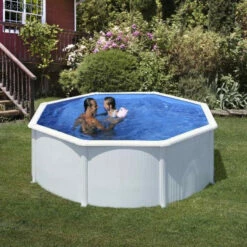 Esta piscina tubular está fabricada con material triple capa resistente de PVC-poliéster, con un total de 12 soportes tubulares pintados en epoxi para evitar la corrosión y el óxido. En cuanto al diseño del liner, éste presenta un color gris claro para dar un toque sobrio al exterior de su casa, y el interior del liner simula el gresite.