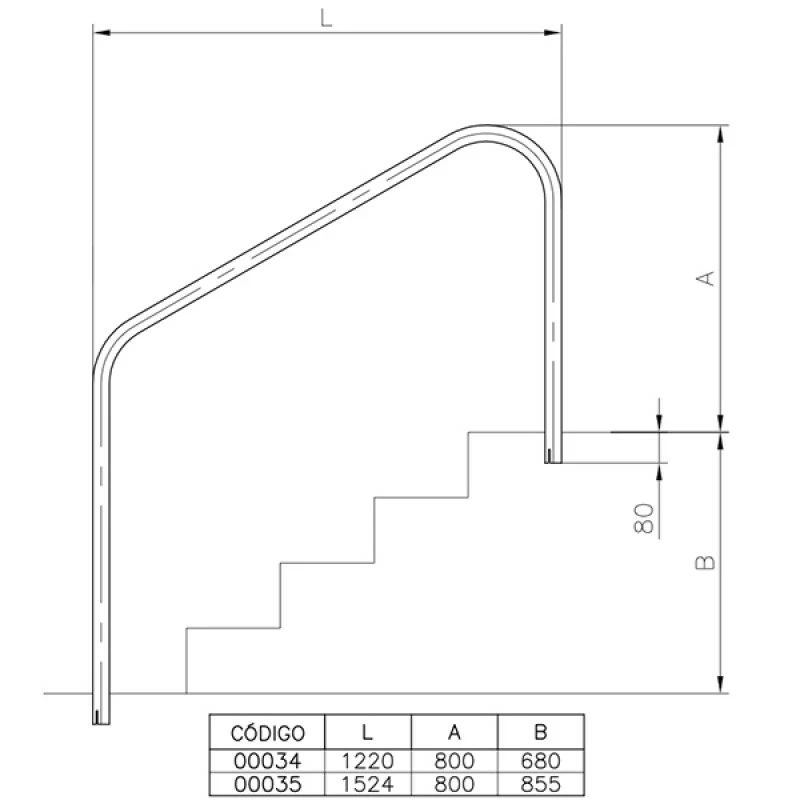 Ideal para la sujeción y acceso a piscina enterradas con escaleras fabricadas de obra, disponible en varias dimensiones de longitud.