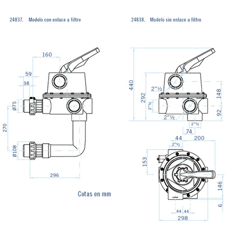 Trabajan con 6 vías fácilmente seleccionables con la llave que permite realizar todas las funciones de limpieza y filtración del agua de piscinas así como de mantenimiento de filtro y lavado de arena.